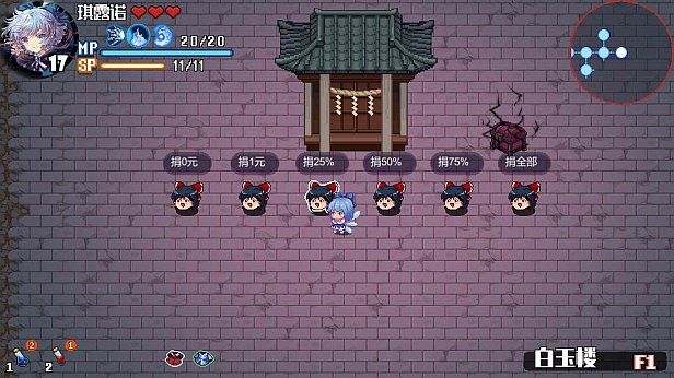 每层迷宫尽头,与BOSS作战用的开阔房间。梦想乡的少女将在这里展开华丽的弹幕战,而且获得丰厚的打败奖励!打起精神竭尽全力吧!